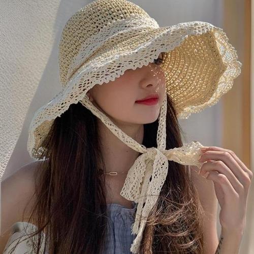 레이스 리본 밀짚모자 스트랩 공주 라피아햇 휴양지