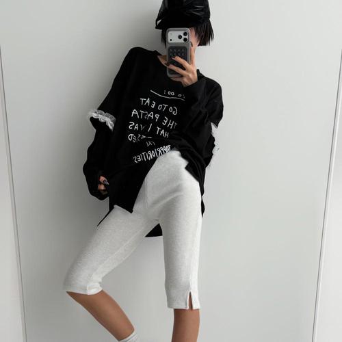 |KSTA0EF|여성 키치 스타일 레터링 레이스 슬릿 박시 레이어드 티셔츠