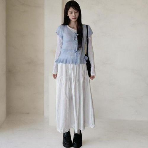 [엘루이즈][엘루이즈] 모드니 레이어드 레이스 셔링 리본 밴딩 롱 스커트(4color)