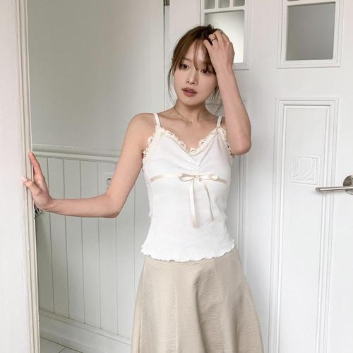 [옷자락] 여자 페미닌 데이트룩 레이스 리본 골지 슬림 끈나시