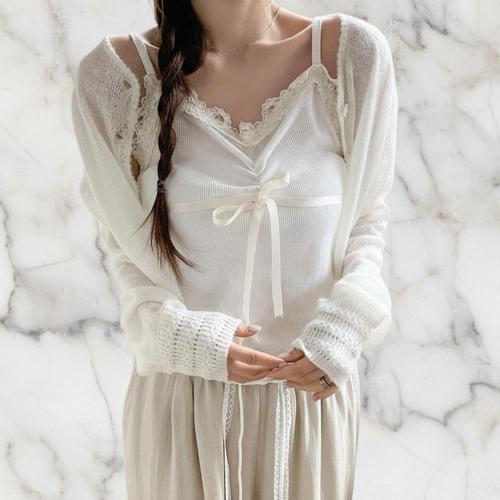 [옷자락]여자 페미닌 데이트룩 레이스 리본 골지 슬림 끈나시
