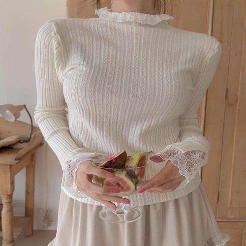 [옷자락]여성 레이스 레이어드 목폴라 골지 슬림 긴팔 니트