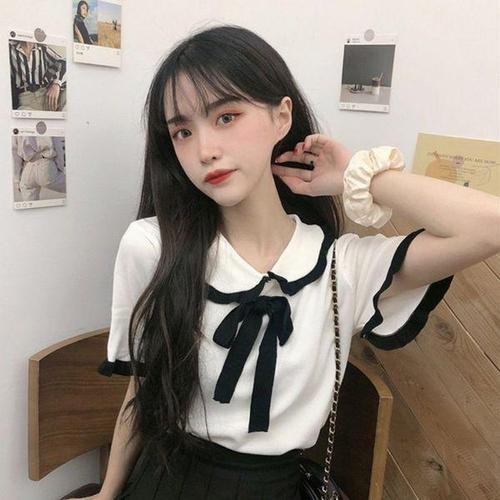 여름 일본 로리타 스위트 걸스 반팔 탑 여성 고스 레이스 보우 셔츠 싱글 브레스트 블라우스 인형 칼라 슬림 티셔츠 New