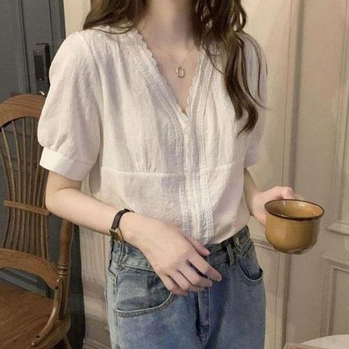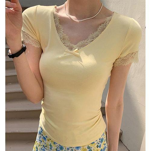 CNYISHE 레이스 패치워크 솔리드 반팔 여성용 V넥 시스 패션 티셔츠 섹시 클럽 티셔츠 우아한 캐주얼
