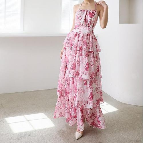 [바이어스]홀터넥 끈 캉캉 티어드 프릴 롱 원피스 바캉스 휴양지 (10173627A)