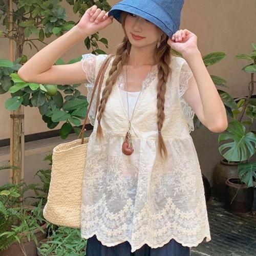 여성 민소매 티셔츠 캐주얼 봄 여름 솔리드 레이스 상의 루즈핏 심플 나시티 기질 민소매 셔츠 블라우스 ZZL