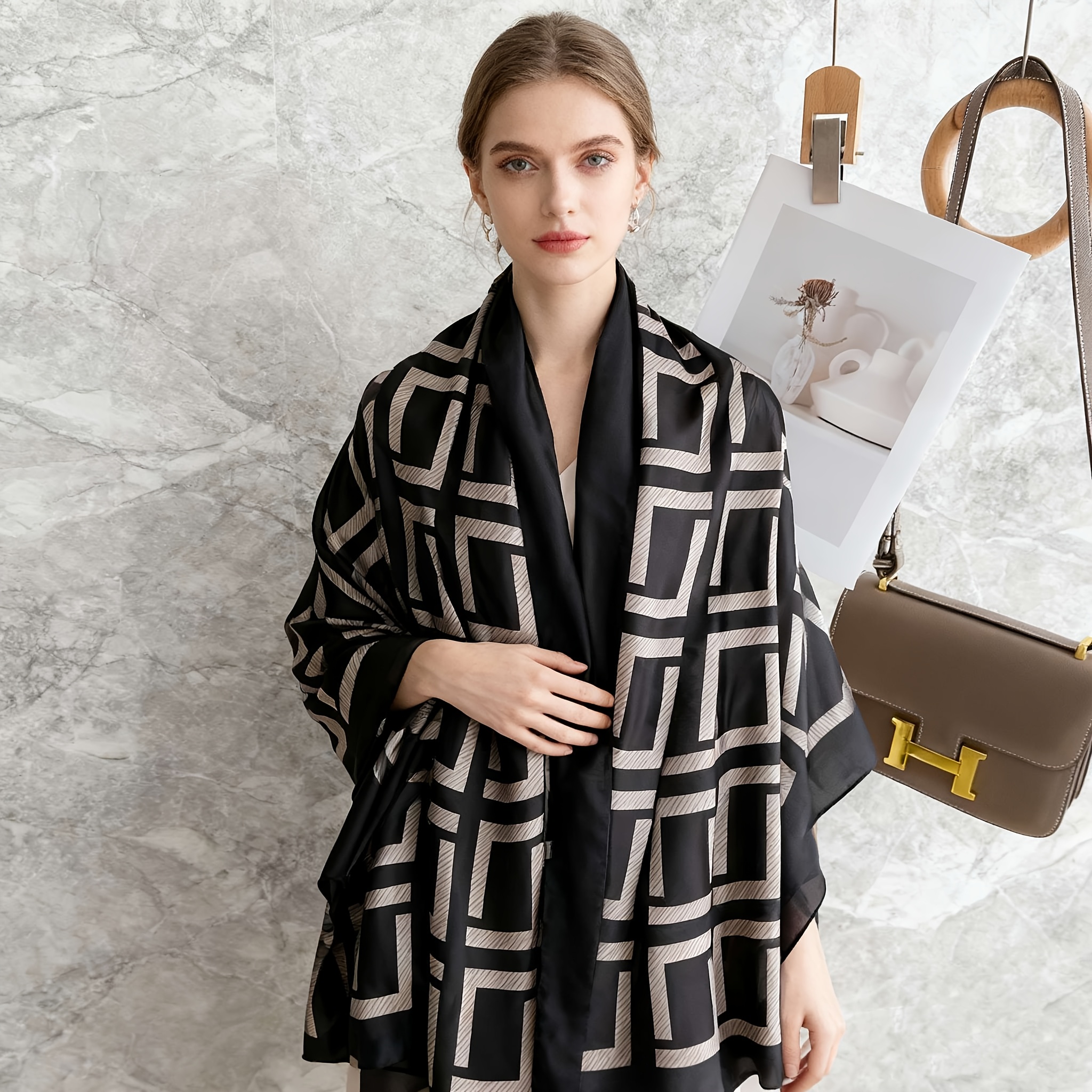 TEMU 여성용 가벼운 통기성 스카프 숄 - 기하학적 프린트 블랙 & 화이트 국립 스타일 디자인, 다목적 비치 타월 & 봄 여름 외출 패션 액세서리, 머리 스카프, 현대 중국 스타일, 비탄력 원단, 고품질 인쇄|비치타올