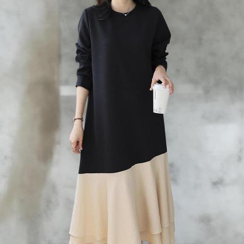[옷자락]여성 빅사이즈 색상 배합 프릴 레이어드 경사 롱드레스