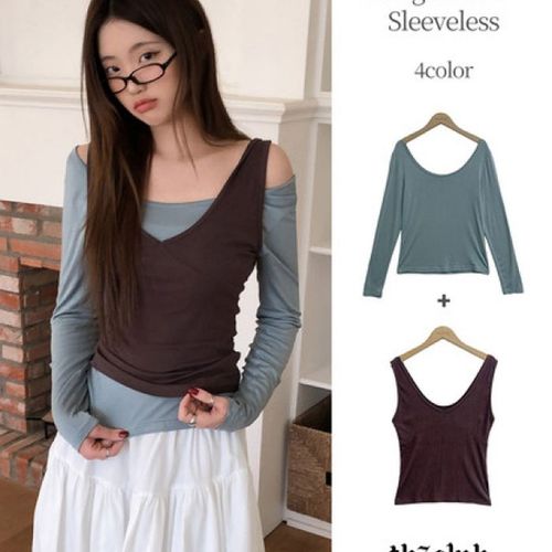더핑크 / 가주 레이어드 배색 골지 나시 + 긴팔티 set