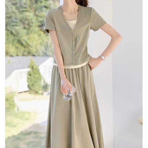 [패션시그널]레이어드가디건티셔츠+밴딩롱스커트 세트 561ACE