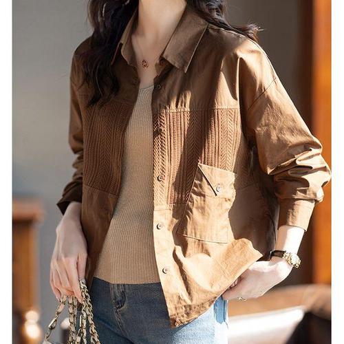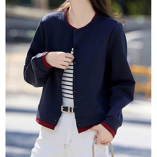 ROYALBELLE 여성 배색 데님 레이어드 재킷 포켓 캐주얼 루즈핏 스포티 카라넥 재킷 E0091506