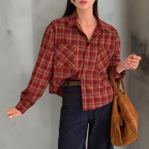 [옷자락]여성 캐주얼 두 개 포켓 큰 체크 레이온 크롭 셔츠