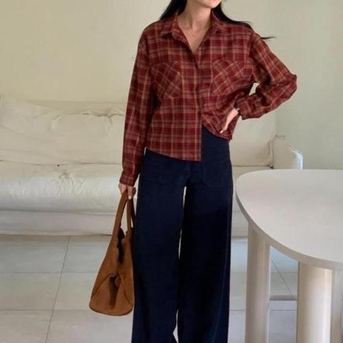 [옷자락] 여성 캐주얼 두 개 포켓 큰 체크 레이온 크롭 셔츠