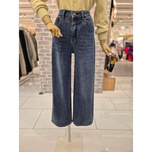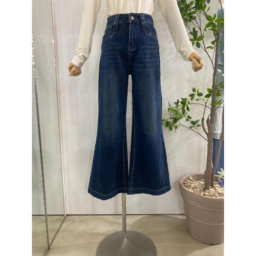여성) 오비안밴드 시계포켓 틴 캣워싱 양모 스트레이트 데님 팬츠 다크블루