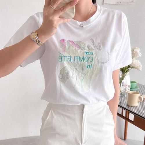 [다잇템]여성 큐빅 자수 레터링 실켓 여름 반팔 티셔츠