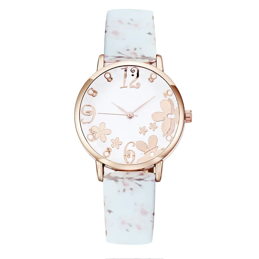 릴리프 플라워 여성용 시계 귀여운 신선한 프린트 가죽 밴드 쿼츠 시계 세련된 학생 로즈 골드 프레임 슬림 케이스 손목시계