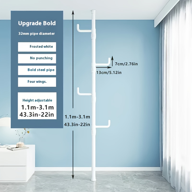 TEMU 조절 가능한 텐션 로드 옷걸이, 43~122인치, 4개 후크 포함, 코트, 재킷, 모자, 스카프용 - 거실, 발코니, 주방용 - 블랙|행거
