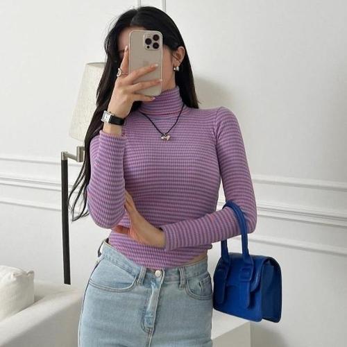 [옷자락][다잇템] 여자 하이넥 잔스트라이프 롤리팝 슬림 캐쥬얼 니트_15619129_588870