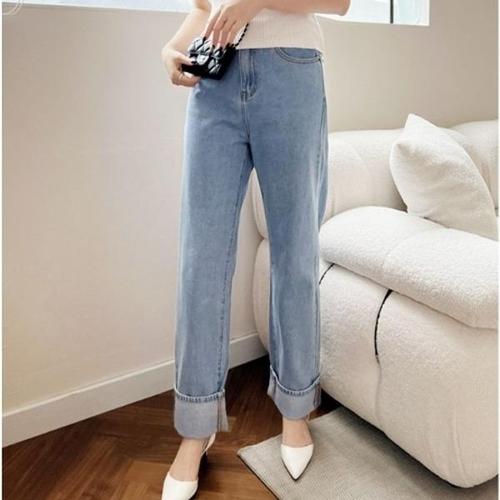 오스틱니 [날씬해보이는] 105kg까지 여성 겨울 빅사이즈 밴딩 롤업 밑단 수술 와이드 9부 청바지 봄 여름 통바지 슬렉스 진 연 블루 큰옷 여성의류 여자 데일리 캐주얼 데님 팬츠