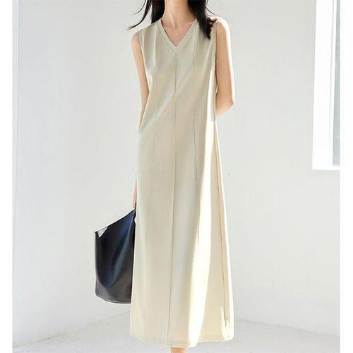 [패션시그널]솔리드 브이넥 민소매 롱원피스 A501F0