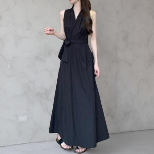 [옷자락]여성 브이넥 랩형 허리 스트랩 민소매 롱 드레스