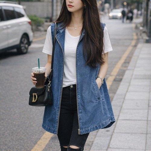 [핑크엘리제]롱데님베스트 슬리브리스 빈티지 에스라벨데님조끼