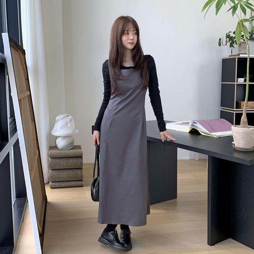 [신상오픈런]여성용 롱 원피스 세트 타이넥 긴팔 티셔츠 뷔스티에 스타일
