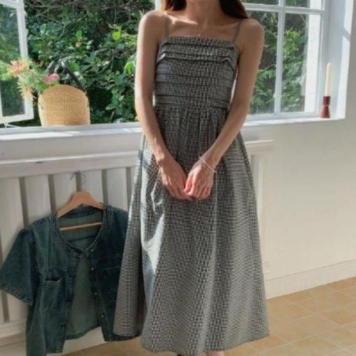 [신상오픈런]여성 체크 패턴 뷔스티에 플레어 롱 드레스