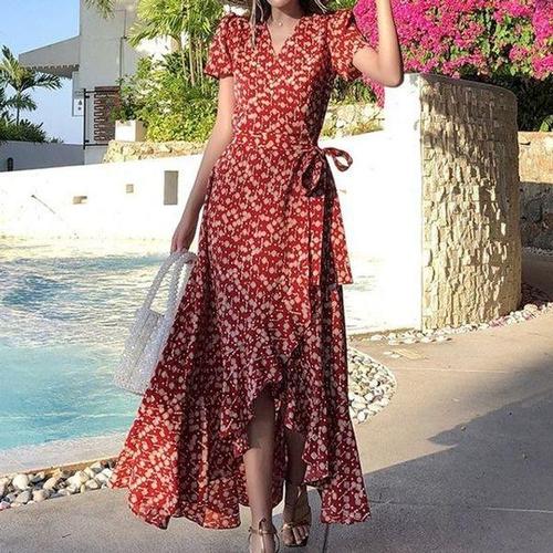 여성 여름 민족 패턴 등받이 분할 허벅지 드레스 숙녀 여름 옷 Boho 패션 프릴 트림 롱 드레스 비치