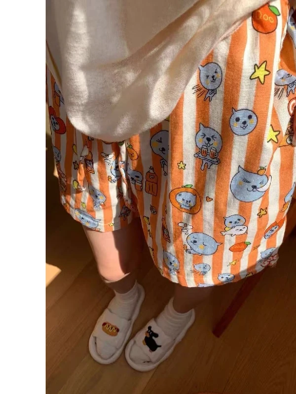 귀여운 만화 프린트 면 반바지 파자마 바지 여성 여름 홈 레저 편안한 통기성 중간 허리 밴드형