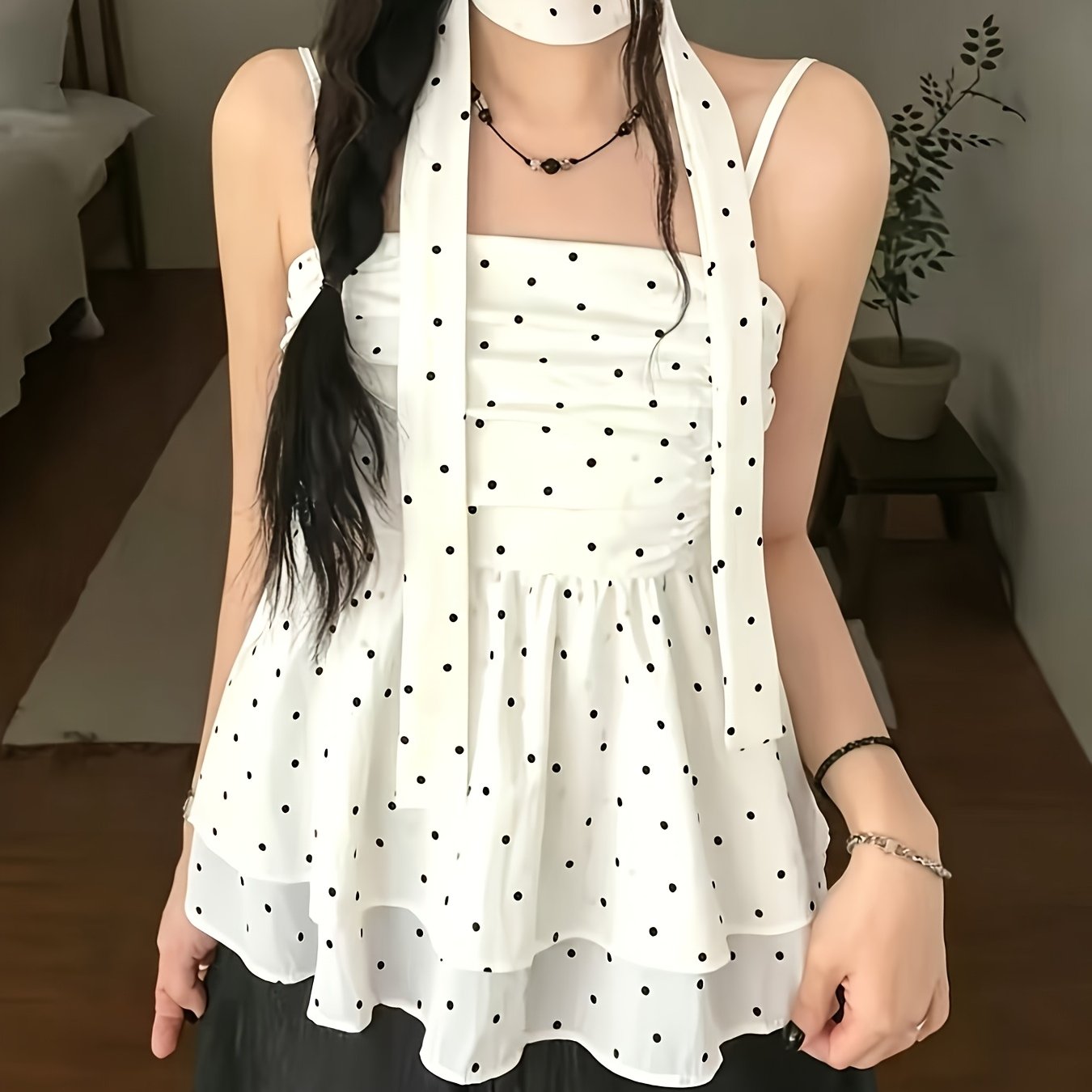 TEMU 폴카 도트 러플 트림 캐미솔 탑, 스위트하고 엣지있는 스파이시한 루즈핏 캐미 탱크탑, 무료 넥타이 포함