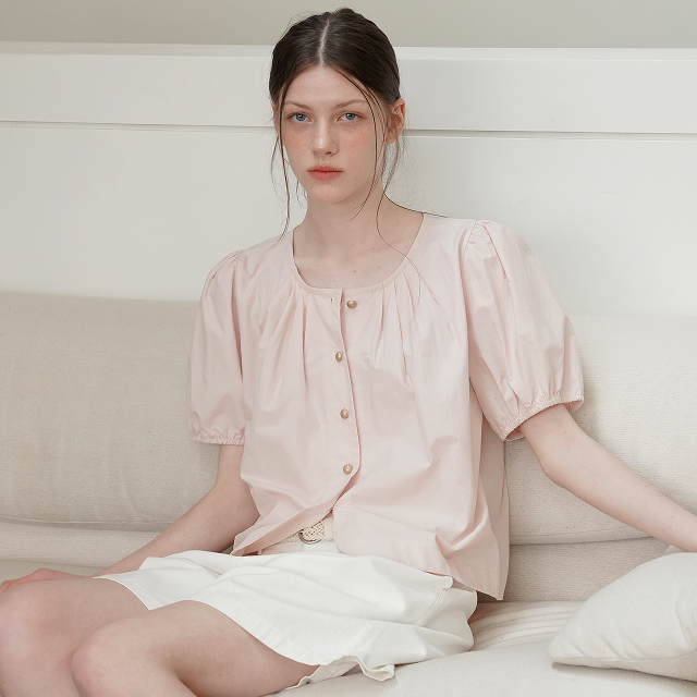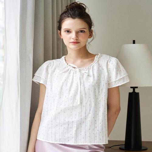 [르샵]플라워 프릴 리본 백 버튼 반팔 블라우스 (DQ2BA018A)