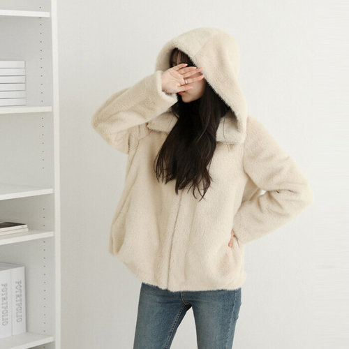 캐주얼 여성 오버핏 페이크 밍크퍼 후드 집업 자켓