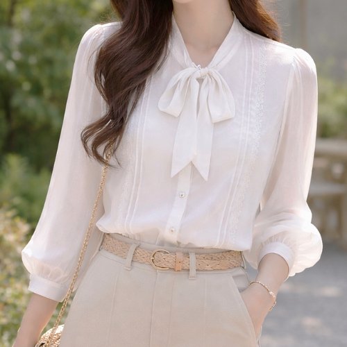 여성 루즈핏 시스루 레이스 리본넥 블라우스