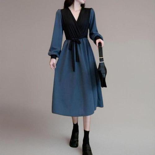 [신상오픈런]여성용 배색 V넥 리본 스트랩 플레어 롱 드레스