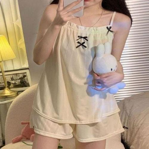 [미라클세븐]여성용 리본무늬 캡슬리브 반팔 티셔츠 팬츠 잠옷 세트