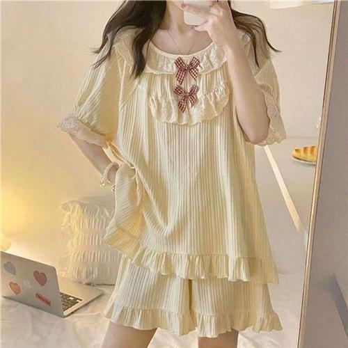 [신상오픈런]여성용 노란색 리본 프릴 반팔 상의와 반바지 파자마 세트