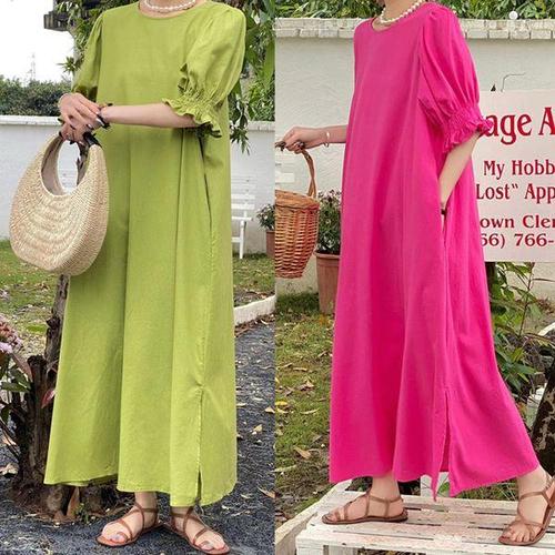 POMTOR 여름 여성 꽃무늬 면 린넨 롱 원피스 엄마 빅 사이즈 셔링 원피스