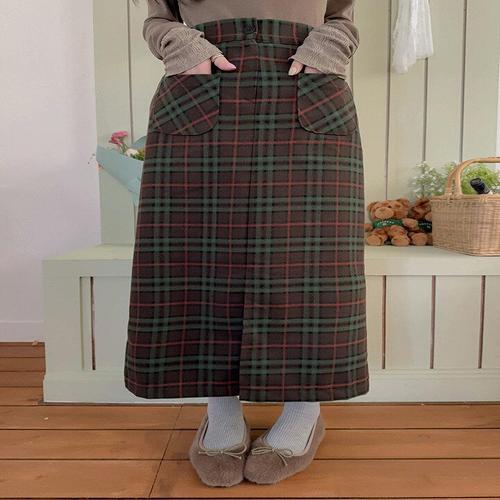 [엘루이즈][엘루이즈] [울터치/뒷밴딩] 뮤엔드 포켓 모직 체크 앞트임 롱 스커트(3color)