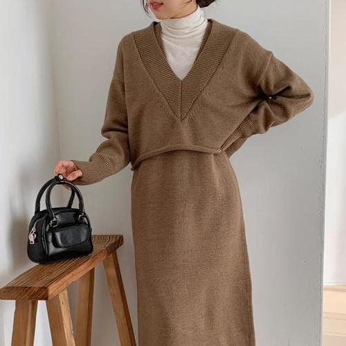 [다잇템][다잇템] 여성 그랜마코어룩 V넥 드레스 롤링 슬리브리스 스웨터 세트_15563038_588872