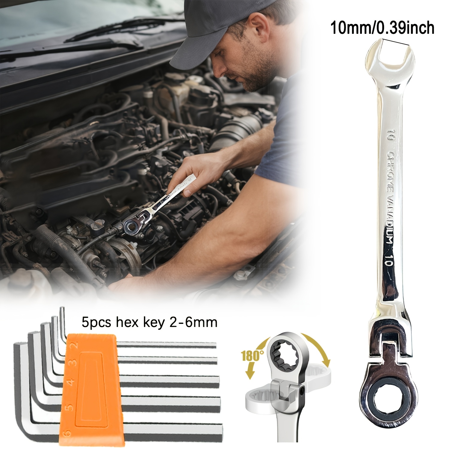 TEMU 72T 역방향 조절 토크, 다기능 자동차 수리 도구, 라쳇 렌치 1개 및 육각 렌치 5개 포함된 6pcs 헤비 듀티 듀얼용 라쳇 렌치 공구 세트 - 자동차 유지 보수 및 프로젝트에 적합