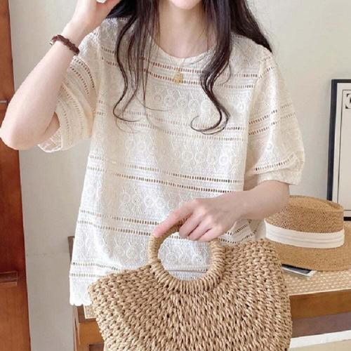 [오너클랜]인기상품 라운드넥 반팔 망사 자수 티 블라우스 캐주얼웨어 [WFLHA6K_260227]