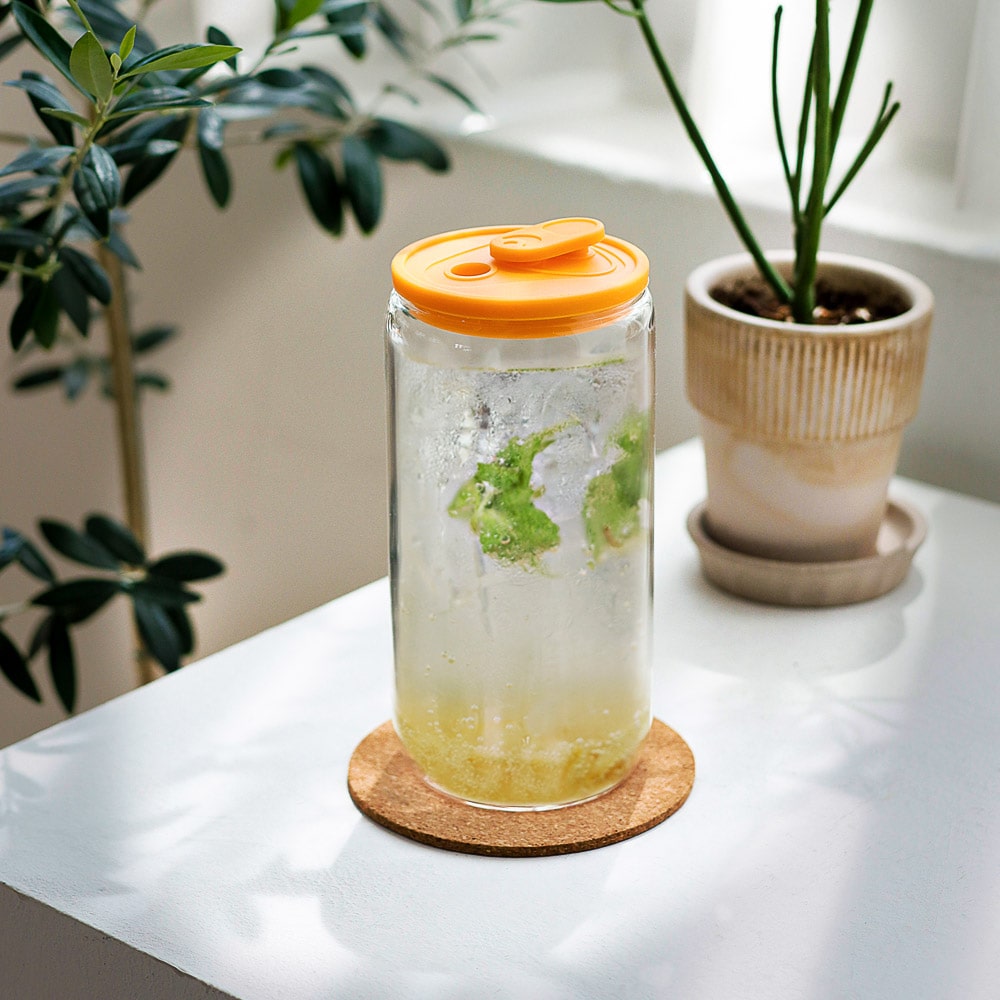 헥사 비어캔 내열유리컵 500ml 옐로우 실리콘뚜껑 라떼잔 홈카페