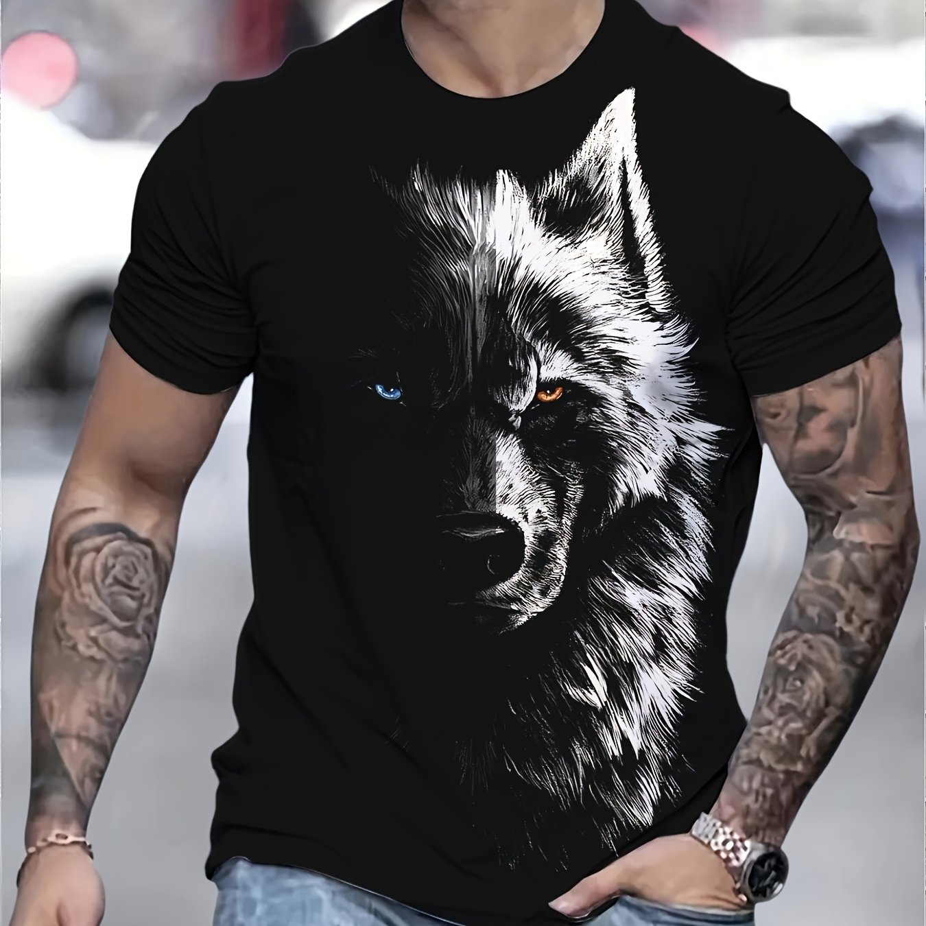 TEMU 남성용 빈티지 늑대 울부짖는 티셔츠 - 100% 폴리에스터 반팔 라운드넥 티 & 동물 프린트 - 캐주얼 & 캐주얼 사계절 상의
