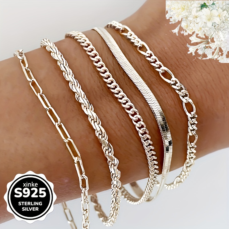 TEMU 925 실버 쿠바 링크 팔찌 5개 세트, 스타일리시하고 우아하며 여성에게 완벽 | 이상적인 휴일 선물, 데일리 주얼리 및 파티 액세서리