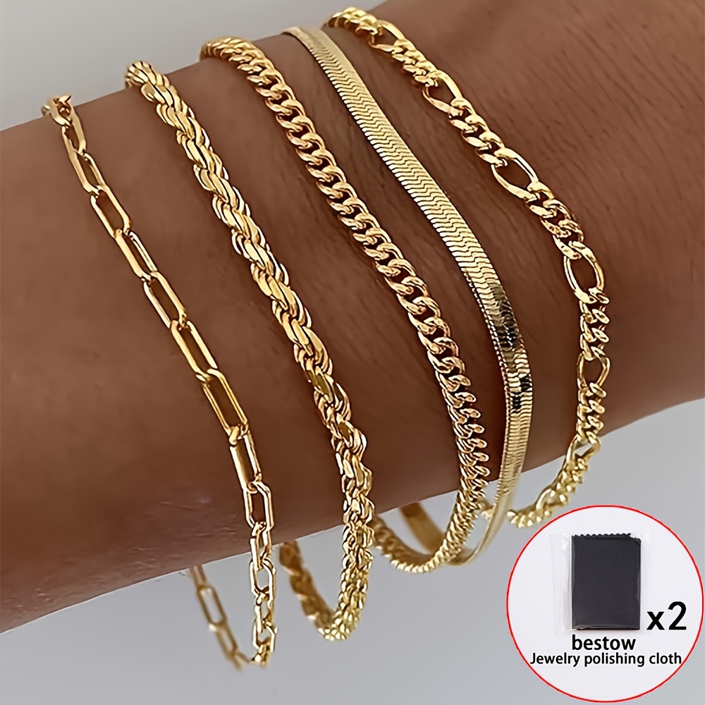 TEMU 여성용 5개 세트 18k 금도금 스테인리스 스틸 팔찌 세트 (+2 보석 청소용 천 포함), 우아하고 고급스러운 여성용 보석 세트, 일상 및 파티용으로 완벽, 생일 선물