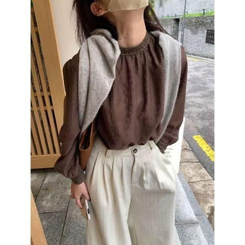 [샵앤]여성 레이스 셔링 라운드 오피스룩 긴팔 블라우스 SML-WBL-4919-브라운