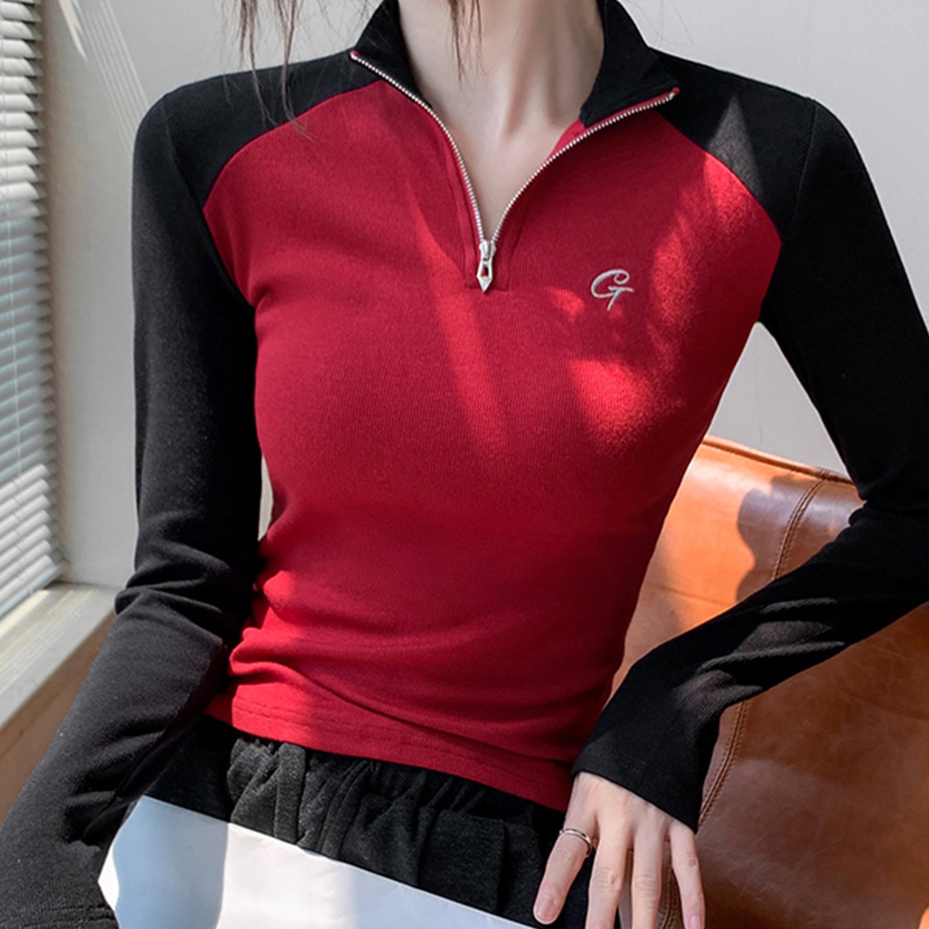TEMU 여성용 우아한 하프 지퍼 장식 티셔츠 - 레이어링 탑, 자수 디테일, 미디엄 스트레치 슬림핏 블라우스, 가을/겨울용, 지퍼 넥라인으로 다른 레이어와 함께 입기 좋음