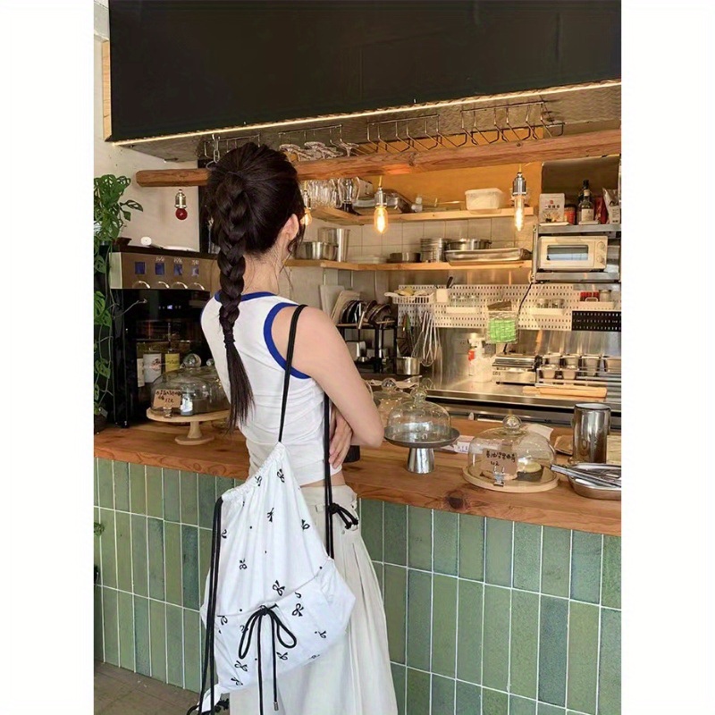 TEMU 한국 스타일 스위트 & 캐주얼 화이트 백팩, 블랙 보우 프린트 - 접이식 끈 조절 가능, 탈착 가능한 어깨끈, 여성 및 학생용 대용량 가방, 넉넉한 내부 공간