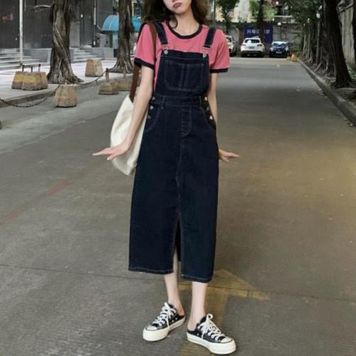 심플 데님 슬림끈 멜빵원피스 앞트임 캐주얼 여친룩